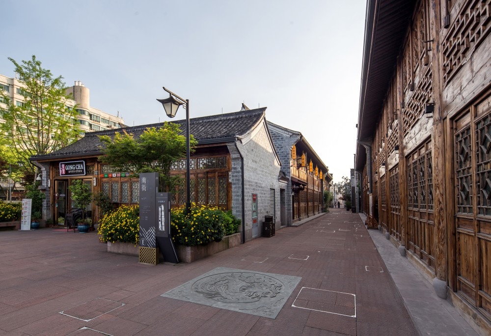本项目总体规划上根据历史资料,尽量保留传统街巷脉络,还原“南门三市”的“一河一街一市”格局。街区内部有拥有文保单位一处,文保点6处。新建建筑创造性地在内部钢筋混凝土结构基础上,外露部分均采用木结构形式,细部尺度亦最大限度遵循明清建筑样式,与文保建筑协调融合。配套新建可容纳逾500个车位的地下室,满足景区停车的基本要求。