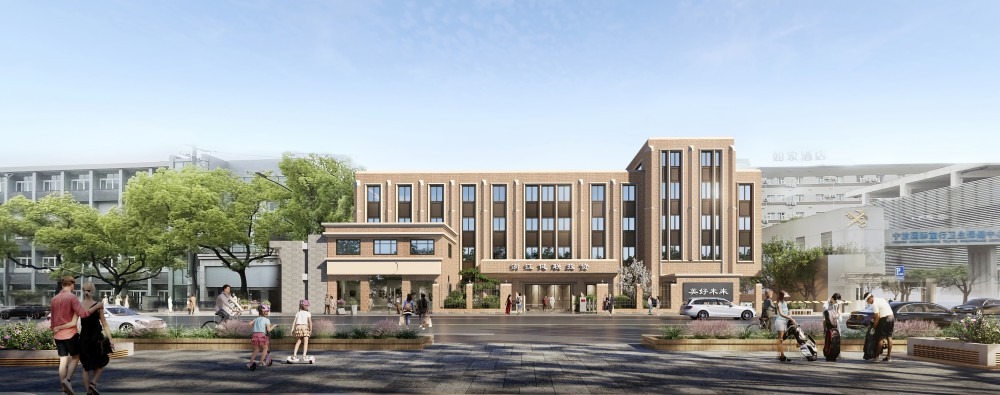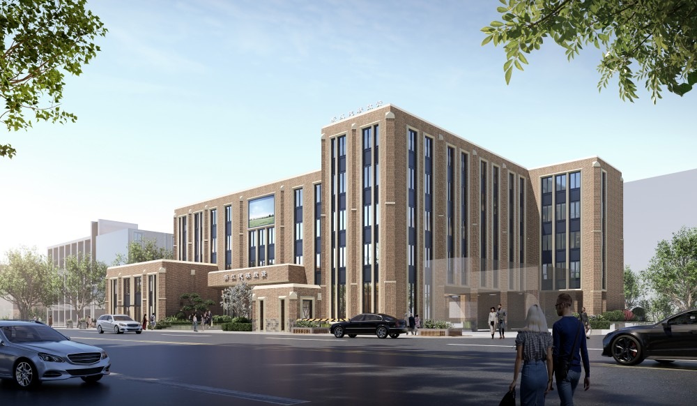 建筑立面上采用竖向线条及三角形柱式形成纵向挺拔的视觉效果,材料上大面积红黄砖的使用也给建筑增添了活力。