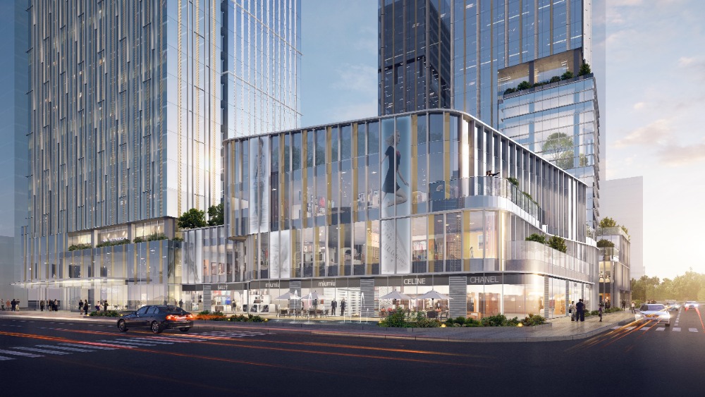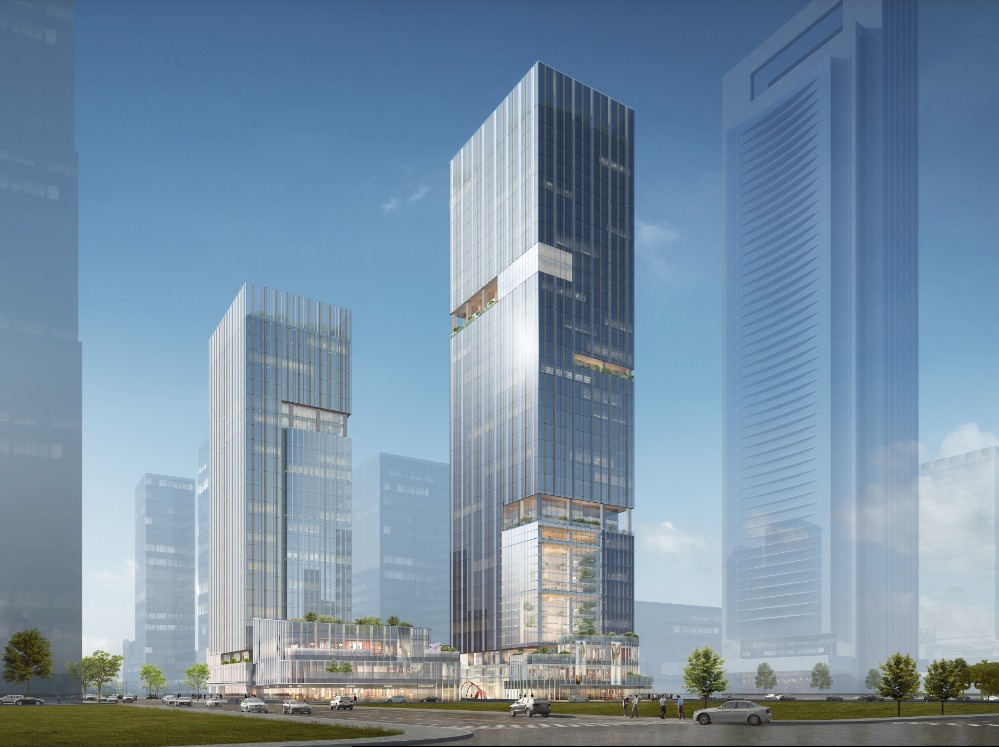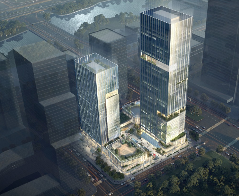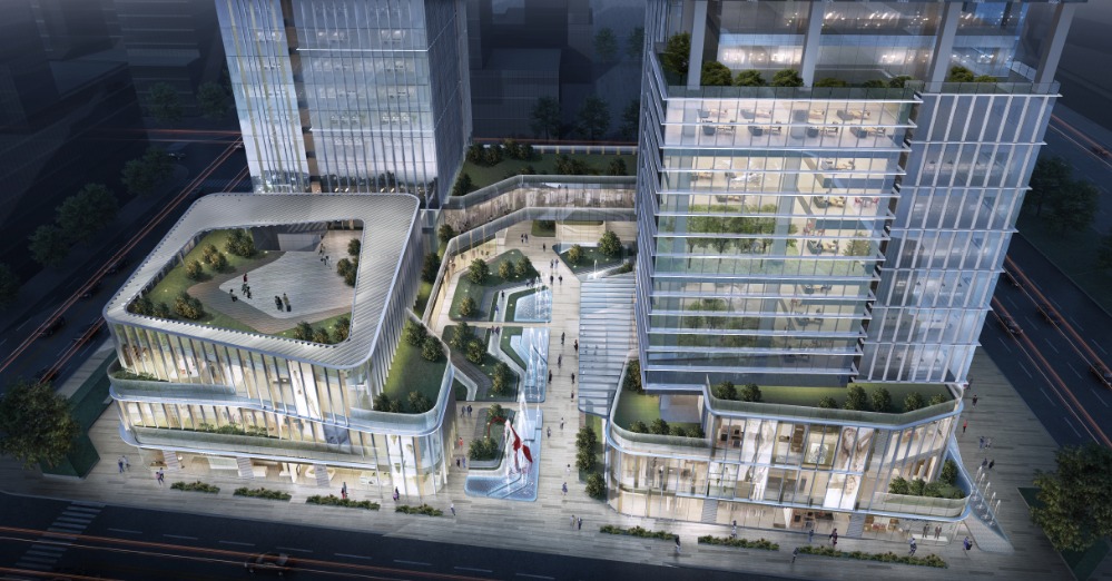 本案将三栋办公塔楼及裙房的商业亭一起形成错动式半围合形式的大楼+开放型中心广场的形式,体现立体花园城市开放感,将基地内外的城市环境与功能融合形成一座微型城中城。基地东侧中心广场延续东面中央公园的自然景观,并向北、西、南三面渗透,向上通过共享景观平台及塔楼空中花园将绿化垂直往上延伸,形成立体花园城市,让商务、服务、人才、自然等诸要素和谐共生。