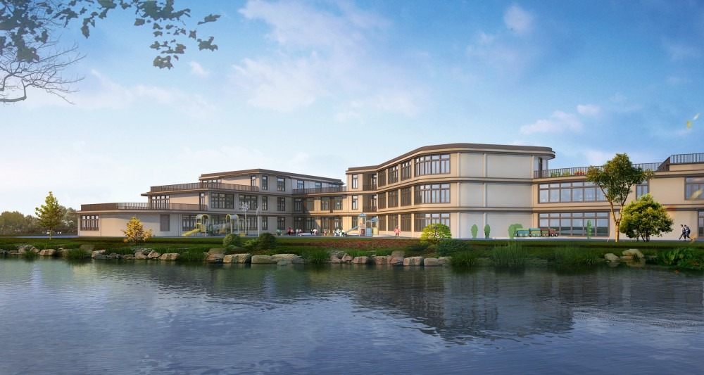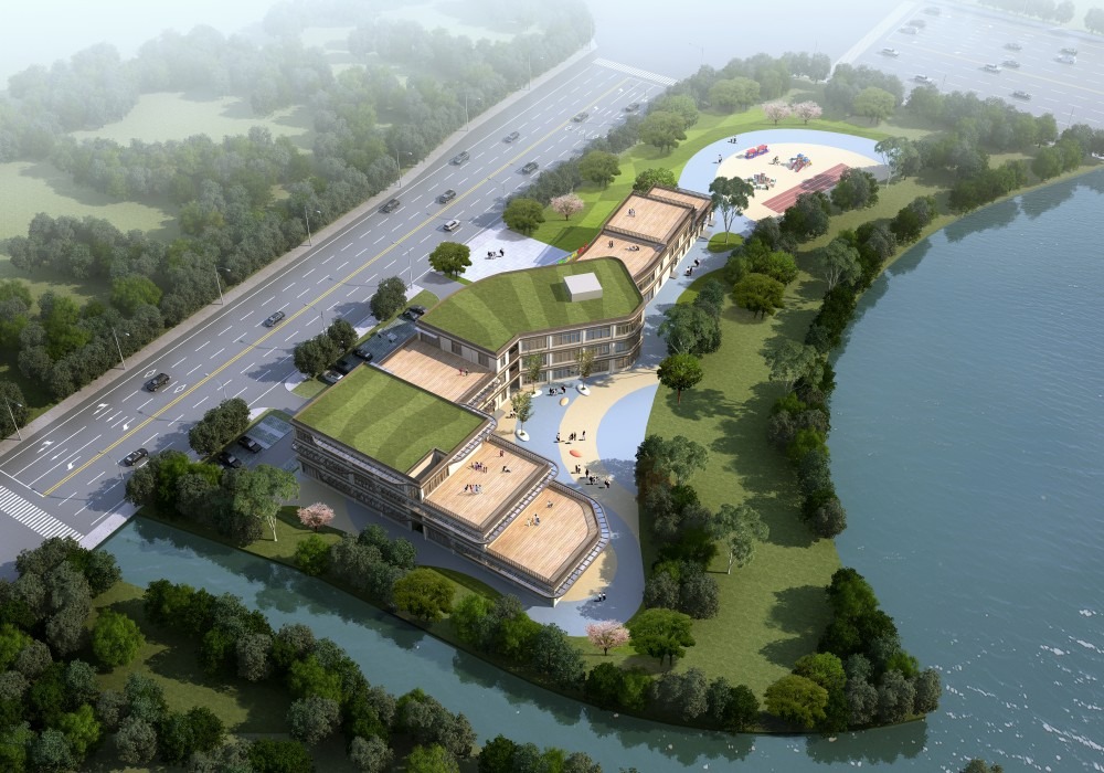 场地东侧南侧毗邻九曲港,我们设置了面向九曲港的中庭以创造更多充满自然的开放空间。教学区整体呈C 字形,将景观引入活动场地,使幼儿生活更加贴近大自然,同时空间界面和场地采用弧线处理,营造丰富有趣的空间形态。