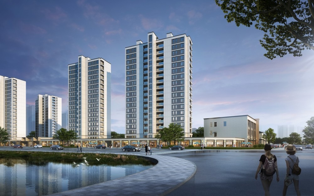 南面设置低层排屋,沿北侧和西侧主要道路布置底层商铺,形成一定的经济效益。在高层区与低层区之间设置公共景观绿化,