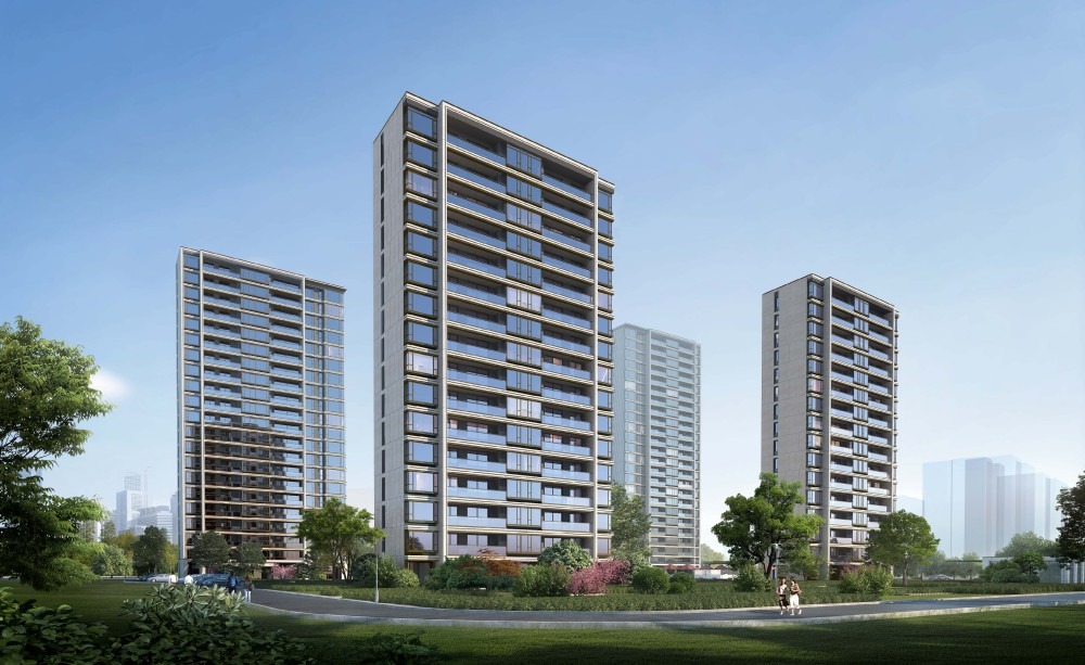 建筑设计赋予整体建筑以简练细致、整体大气的内敛气质,以提升区块建筑群体的品质。主楼采用新古典主义建筑风格结合现代居住住宅尺度,通过对建筑体型比例的推敲,立面元素精细设计,使得园区建筑的立面比例关系舒适。建筑形象或舒缓或挺拔,立面设计的精致细腻还表现在建筑对于用材的把握上。通过墙面的深浅仿石涂料,玻璃窗及百叶的搭配,以及石材基座的设计,使得建筑整体呈现出典雅、内敛、现代的形象效果。