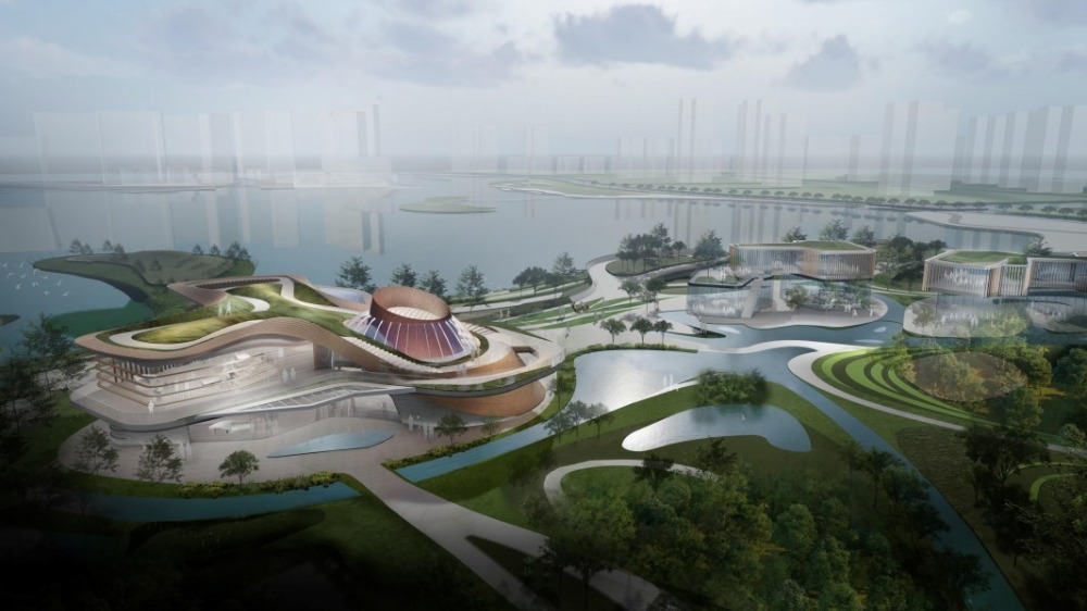 本案位于明湖南区工程南岸中心地块。由一栋展示中心,两栋小商业,一栋管理用房以及地下室组成。本案的设计概念受浪潮的奔腾动态而启发,拟通过有机动感的地标建筑形态表达出勇于创新,乘风破浪的宁波精神。