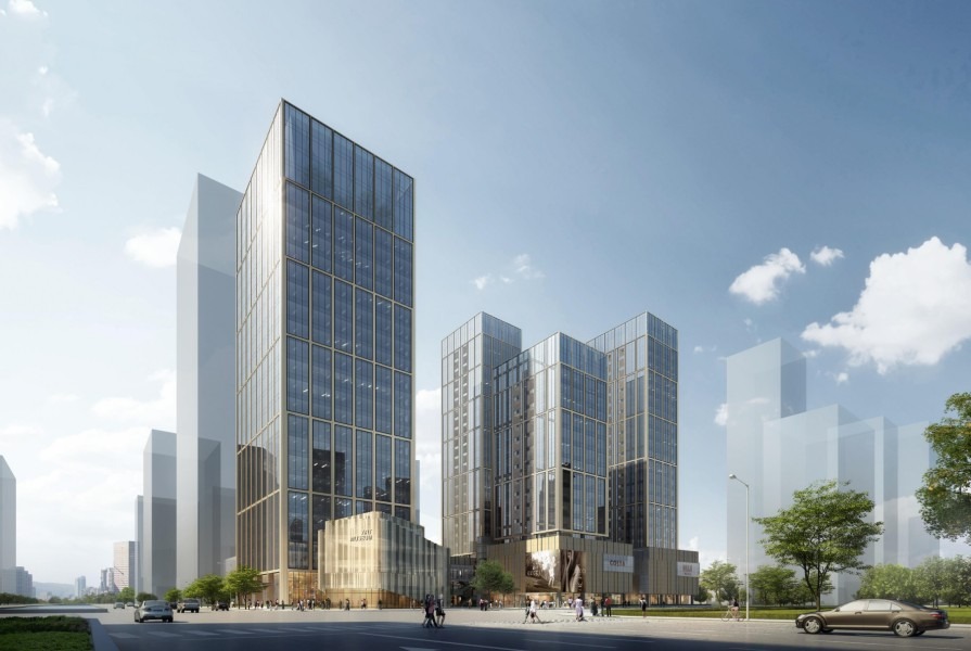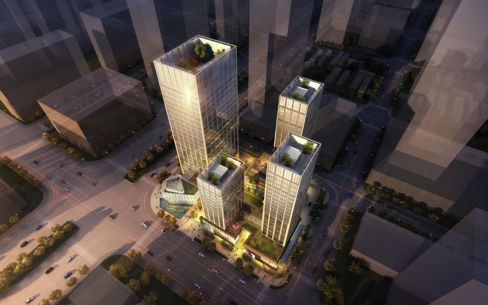 其天际线由西北角的转角商业最具有近人尺度(E#, 22.45米),建筑逐步升高(A#楼65米,B#楼93米、C#楼99米),最终在主塔楼达到最高点(D#112米)。变化丰富的天际线是本项目一大特色,在办公楼林立的核心区也是独树一帜。