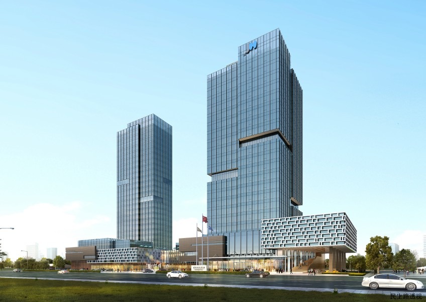 设计说明:本项目在充分考虑城市空间形态和协调与天明湖景观的基础上,融入现代建筑理念,利用堆垒的理念,让建筑在天明湖畔自然生长,象征着建新赵氏集团稳重、进取、蒸蒸日上、利于天下的企业形象。