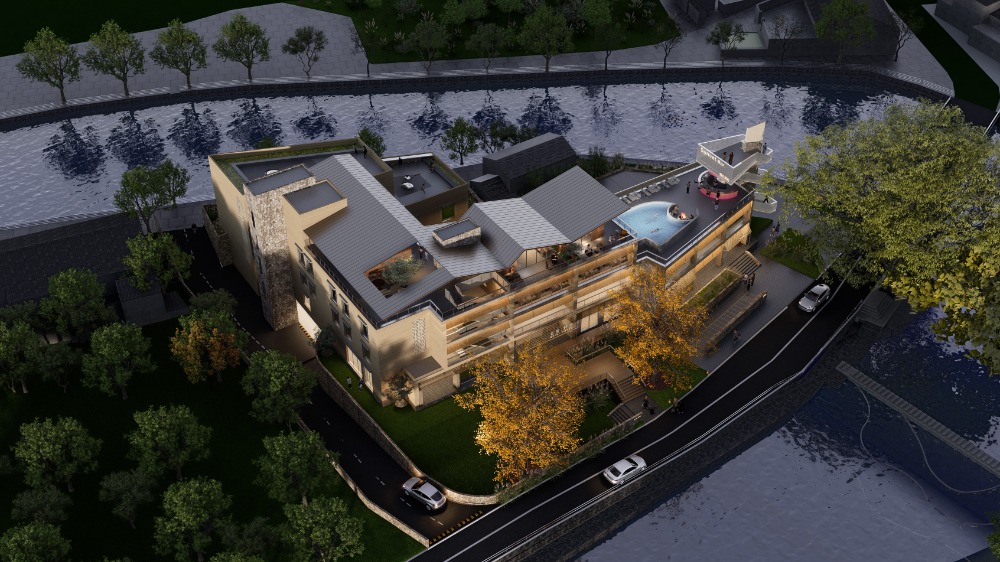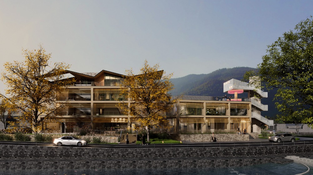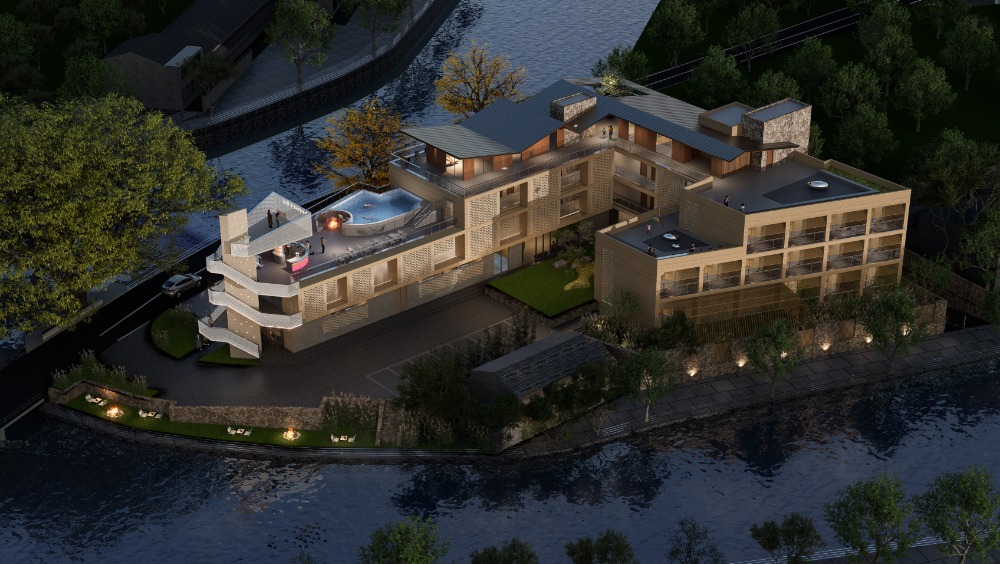 场地三面环水,竹海环绕。自然景观优渥。希望塑造一种和山体自然融合的景观意 向,依照场地地形和周围现状,形成 U 型的建筑形态,沿着最佳景观面,设计了层层退 台的方式,保证场地内的景观最大化。建筑与自然山水契合相融的设计手法,与自然有 着相互的照应,感受四季的变化与空气的流动,打开外立面汲取周边自然景观价值,形 成流动的舒适的灰空间,形成独特的空间内外关系,来丰富整个空间的体验感。 建筑外立面选用了比较轻薄的材质,赋予建筑独特的外观。场地内的景观空间:提 炼场地的景观特色——百年古树,沿着古树可生发丰富多彩的活动:品茶会客 赏景 戏 水 等一系列的延展。希望在此地给予到访者一个专属于这里的记忆。