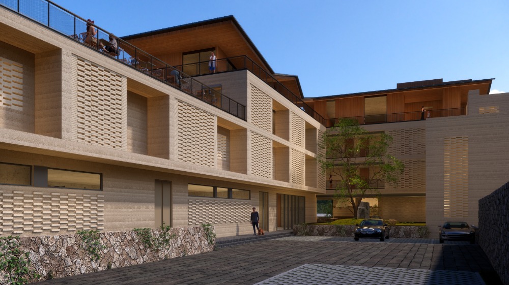 本工程位于四明山镇北溪村,总用地规模约 2776 平方米。总建筑面积为 4036.43 平方米,一层功能为大堂、 餐厅、咖啡厅、院落客房 便民服务中心,配电房及发电机房,二层至四层的功能为观景 客房、屋顶活动平台及活动室、健身房,客房数量为 22 间。