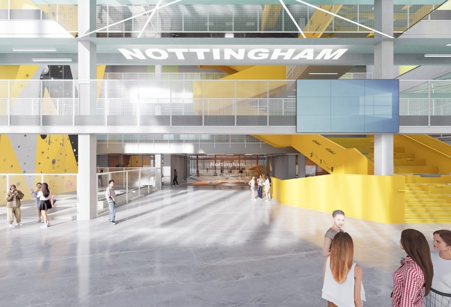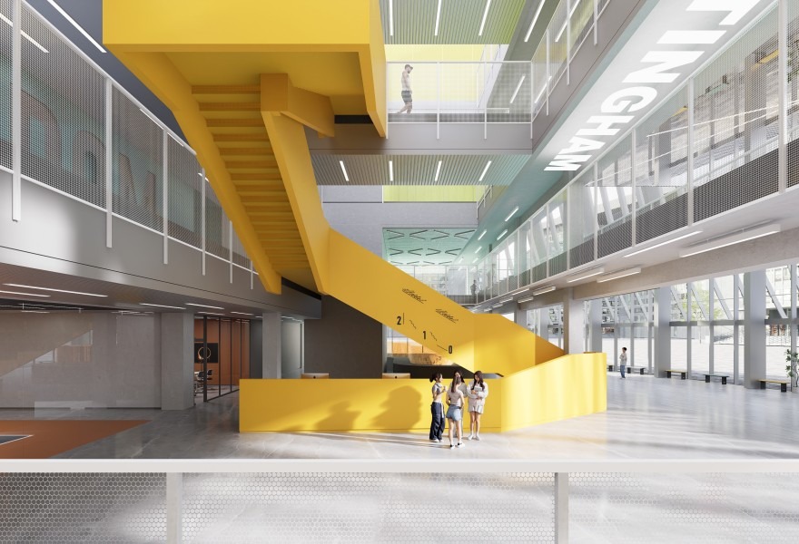 "运动光谱(Kinetic Spectrum)"设计理念以科学化的色彩能量系统重构运动空间体验。通过解构诺丁汉大学校徽的城堡塔楼意象,转化为贯穿空间的动态几何语言,建立学术基因与运动美学的视觉连接。