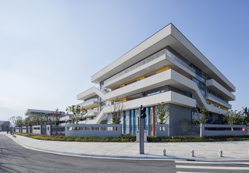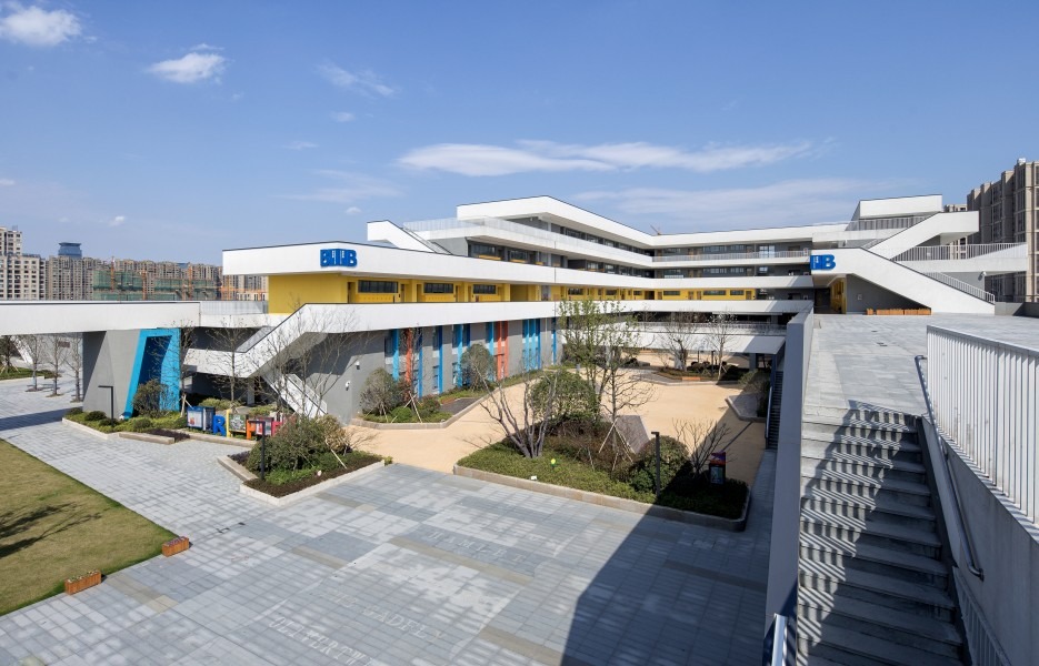 宁波赫威斯学校建设规模约为六万平米,设计秉承折院叠园概念,利用建筑折型形体围合多个庭院:静谧的学习庭院、氛围活跃的运动庭院;在竖向上建筑层层叠退,形成多个开敞的学生活动平台和绿植平台,使景观与建筑有机结合在一起。